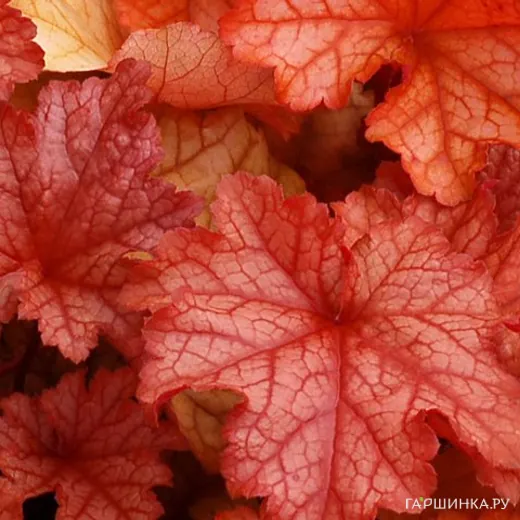 Гейхера Паприка. Высота растения 20см., диаметр 40см, цветоносы около 30 см высотой. Крупные волнистые листья. Цвет изменяется по мере развития листовых пластинок. Вначале они ярко-лососевые, а со временем приобретают теплый пылающий вишнево-коралловый или даже винный оттенок. Особую пикантность растению придает контрастное основному фону светлое, почти белое жилкование.  Цветки белые. Цветет май-июнь.