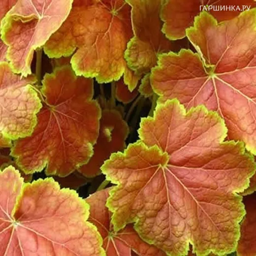 Гейхера Тирамису. Ширина 0,3 м, высота 0,25 м. Цветонос высокий 40 см, окраска цветка розово- красная. Лист резной, глянцевый, плотный, курчавый , красно-желтый, кайма светло-зеленая, подложка обратной стороны темная, прожилки темные.