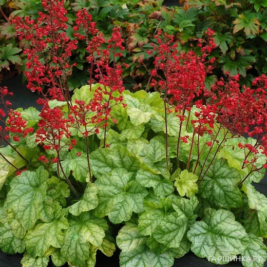 Очень красивая гейхера. Цветочки яркие красные. Разрастается хорошо. Зимует отлично.