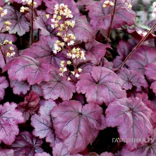 Гейхерелла Плам Рояль - Высота 25 см, диаметр куста 35 см. Высота цветоноса 30-50 см. Сорт с удивительными, блестящими, сливово-фиолетовыми листьями. Окрас не исчезает ни в тени, ни на солнце. Кремово-белые цветки прекрасно сочетаются с темными стеблями.