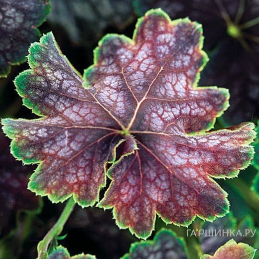 Гейхера Бьюти Колор. Высота листьев 25 см, высота цветоносов 40 см. Листья с серебристыми пятнами и фиолетовыми прожилками. Кайма листьев с изменчивым цветом – от зелёного до кораллового. Листья собраны в прикорневую розетку, зубчатые.