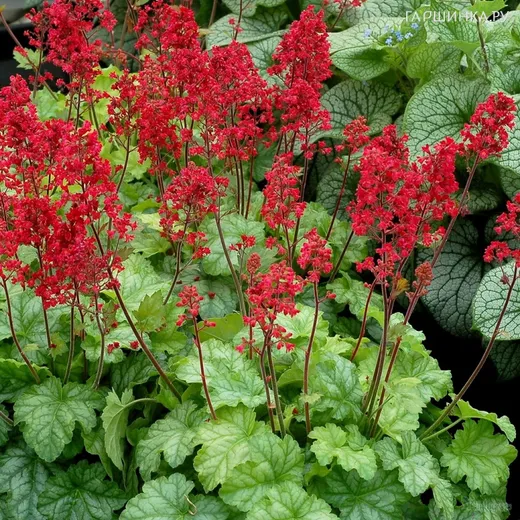 Гейхера Корал Форест. Высота растения 25 см. Диаметр: 30 см. Листья плотные, округлые, гладкие, зеленго цвета; цветки крупные опущенные красного цвета. Цветет июнь-август.