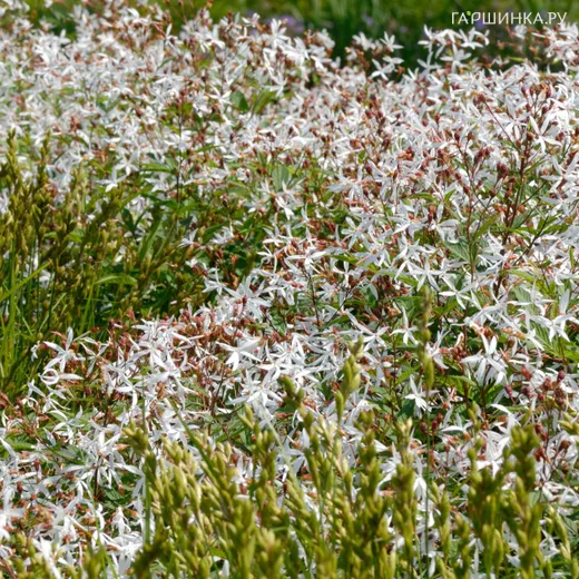 Гилления трехлистная - вертикальнорастущий полукустарник от 60 до 90 (120) см высотой, в нашей зоне ведет себя как многолетник. Разрастется на 60 см в ширину. Имеет красноватые стебли, на которых очередно располагаются короткочерешковые листья из 3-х эллиптических, пильчатых по краю, долей. Прилистники линейные, почти незаметные. Молодые листья имеют эффектный бронзовый оттенок. В июле на тонких концах побегов из красно-розовых бутонов распускаются изящные белые цветки до 2,5 см диаметром, состоящие из 5 свободных, тонких, слегка перекрученных, эллиптических лепестков, белизна которых контрастирует с красными пятираздельными чашечками и цветоножками. В цветках по 10-20 тычинок и 5 пестиков, опыление осуществляется насекомыми. По форме они напоминают цветки гауры. Соцветия - рыхлые ажурные метелки. Цветение продолжается до 2-х месяцев, после чего созревают плоды – сухие кожистые опушенные листовки с 1-4 семенами. После отцветания растение остается декоративным благодаря глубокой красновато-бронзовой осенней окраске листвы, а зимой его украшают звездочки листовок, которые сохраняются до весны.