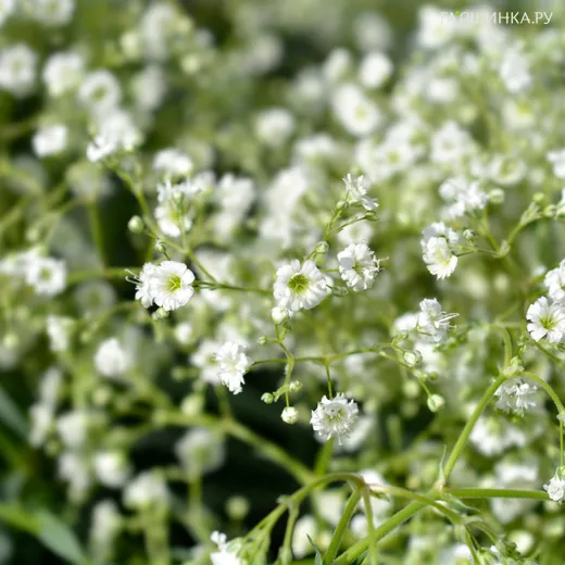 Гипсофила метельчатая Сноуфлейк - травянистый многолетник в форме пышного куста. Высота до 1 м, ширина до 80 см. Начинает цвести в июле и продолжает до конца лета. Растет на солнце или в полутени.