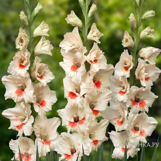 Гладиолус крупноцветковый Аякс 5шт. - многолетнее клубнелуковичное растение семейства Ирисовых. Высота около 100 см. Размер цветка 14-16 см. Лепестки молочно-белые, на нижнем есть ярко-алые мазки. Период цветения с июля по сентябрь.