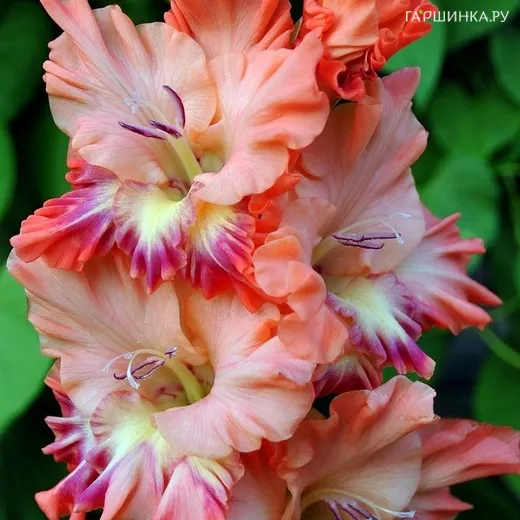 Гладиолус Янтарь 2 шт - многолетнее клубнелуковичное растение семейства Ирисовых. Высота 180см. Крупноцветковый, высокорослый, гофрированный сорт. Окраска цветка лососево-розовые, сиренево-лиловая кайма и наплывы на внутреннем нижнем лепестке в центре.