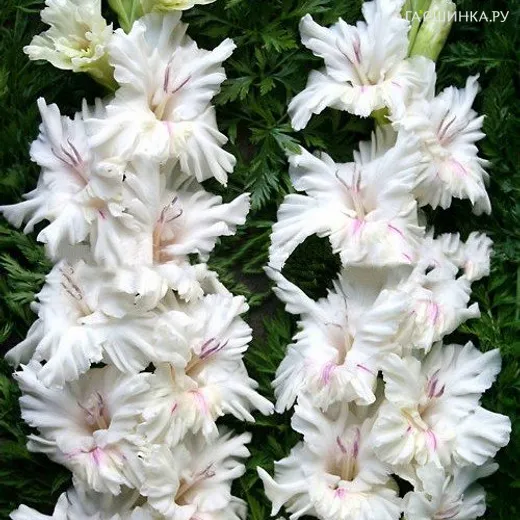 Гладиолус Апостол Петр - многолетнее клубнелуковичное растение семейства Ирисовых. Высота 160 см. Восхитительный белый цветок с розово – малиновыми лучиками выходящими из центра.