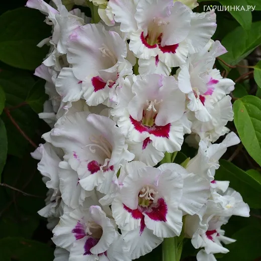 Гладиолус Барборка 2 шт - многолетнее клубнелуковичное растение семейства Ирисовых. Высота 150 см. Белые с розово-малиновыми кончиками лепестков широко открытые цветы. В горлышке пурпурное пятно.