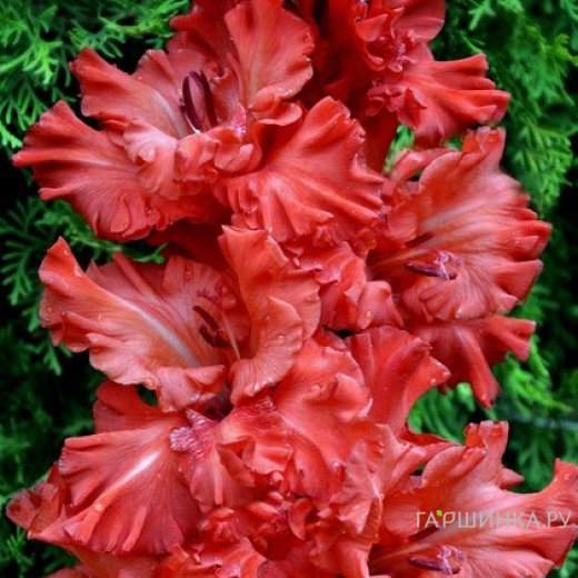 Гладиолус Большое искушение - многолетнее клубнелуковичное растение семейства Ирисовых. Высота 155 см. Изумительный по красоте, мягкого красного цвета. Супергофрированные цветки имеют восковую фактуру.