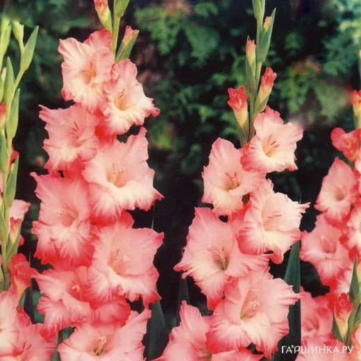 Гладиолус Хеопс 5 шт - многолетнее клубнелуковичное растение семейства Ирисовых. Высота растения 80-110см. Цветки до 20см. Лепестки у основания бледно-розовые с ярко-розовой каймой по волнистым краям. Цветение с июля по сентябрь.