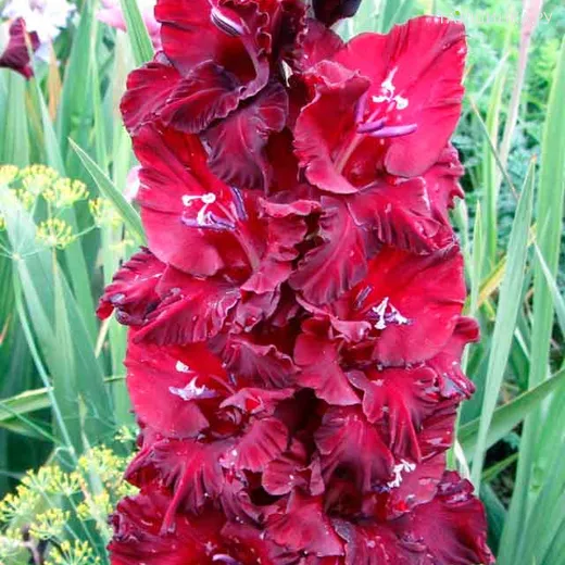 Гладиолус Демон - многолетнее клубнелуковичное растение семейства Ирисовых. Высота 135 см. Бархатные чёрно-красные цветы с красивой сильной гофрировкой.