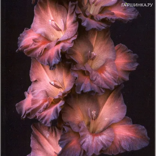 Гладиолус Коричневый халцедон - многолетнее клубнелуковичное растение семейства Ирисовых. Высота 165 см. Дымчато-коричневый с фиолетовым оттенком гладиолус. Мощное растение, высокое прочное соцветие. Очень красивое сочетание коричнево-фиолетовых тонов.