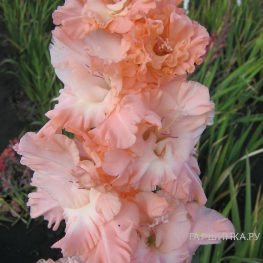 Гладиолус Королева бала - многолетнее клубнелуковичное растение семейства Ирисовых. Высота 150 см. Нежный лососево-розовый цвет. Сильная кружевная гофрировка. Фактура лепестков плотная, восковая.