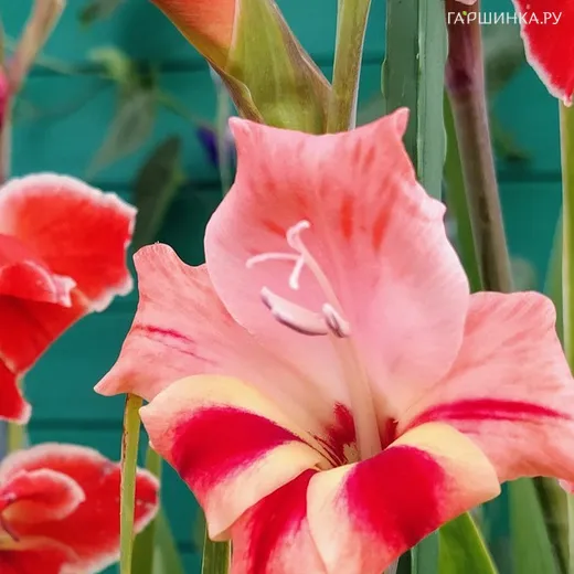 Гладиолус мини Натали - многолетнее клубнелуковичное растение семейства Ирисовых. Миниатюрный сорт высотой 45-60см. Цветок нежно-розового цвета с румянцем на нижних лепестках, ближе к горловине. Цветение с июля по сентябрь.