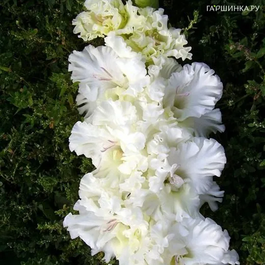 Гладиолус Москва Белокаменная - многолетнее клубнелуковичное растение семейства Ирисовых. Высота 150 см. Белые с чуть кремовым горлышком цветы настолько сильно гофрированы, что выглядят махровыми. При этом цветы с очень плотной восковой фактурой лепестков.
