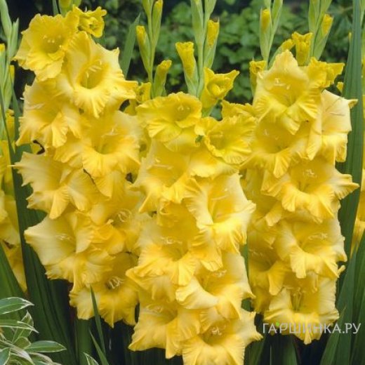 Гладиолус Нова Люкс 5 шт - многолетнее клубнелуковичное растение семейства Ирисовых. Высота 120-130 см. Пышные крупные цветы насыщенно желтого оттенка диаметром 15-18 см. Лепестки волнистые, слегка закручены. Цветение июль-август.