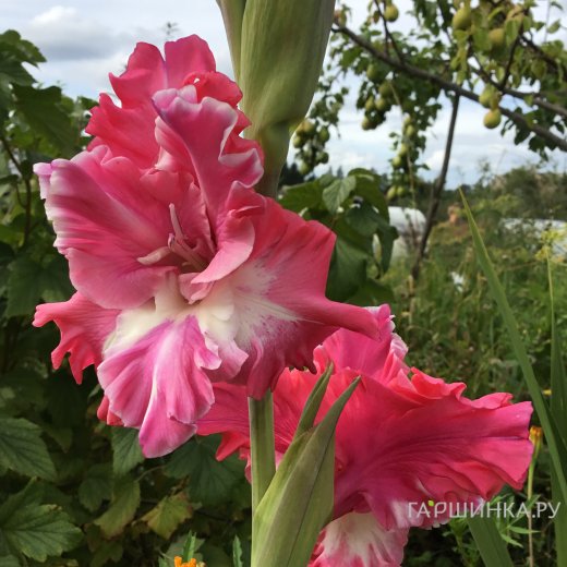 Гладиолус — многолетнее клубнелуковичное растение семейства Ирисовых. Родина - Южная Африка. Имеет ярко-зеленые, крупные (до 80 см) мечевидные листья, среди которых возвышается колосовидное соцветие 30-80 см длиной, состоящее из 15-25 цветков. Цветки сидячие, воронковидные, самой разнообразной окраски. Разные сорта гладиолуса цветут в различные сроки, от очень ранних до очень поздних (с июня по сентябрь). В открытом грунте гладиолус не зимует. В саду применяется в групповых и одиночных посадках, чаще используется в качестве срезочной культуры. Российские гладиолусы - отличаются высоким (до 180 см) и прочным цветоносом, всегда имеют крупный цветок (12-16 см), при этом одновременно открыто 8-10 бутонов! Гладиолусы российской селекции неприхотливы в выращивании! Практически все сорта имеют сильно гофрированные цветы! Изящность и необычная окраска бутонов делает эти сорта идеальными для срезки!