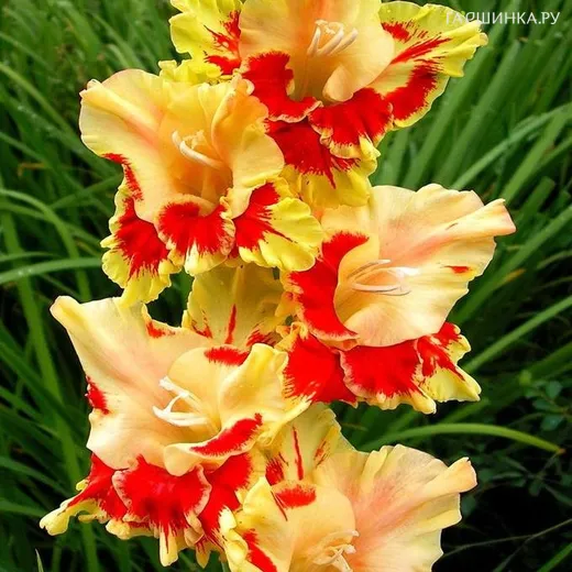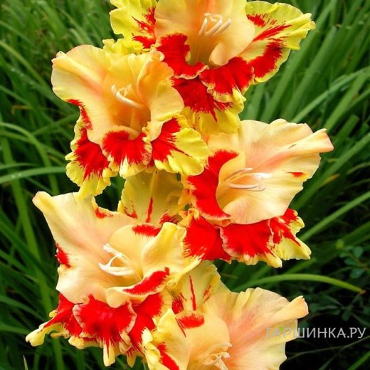 Гладиолус Огни Арбата - многолетнее клубнелуковичное растение семейства Ирисовых. Высота цветоноса 150 см. Размер цветков 11,5-14 см. Яркий и контрастный. Кремовый с большим красным пятном на нижних лепестках. Гофрированный.