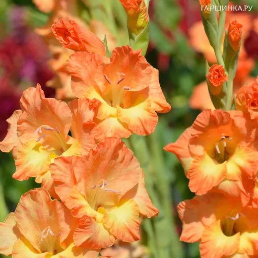 Гладиолус Олимпик Флейм 5 шт. - многолетнее клубнелуковичное растение семейства Ирисовых. Высота: 90-120 см. Насыщенного лососевого или оранжево-розового цвета с желтыми разводами в серединке. Гофрирован крупными складками по краю. Цветение: август-сентябрь.