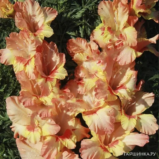 Гладиолус Оранжевый луч - многолетнее клубнелуковичное растение семейства Ирисовых. Высота 140 см. Цветки ярко-оранжевые с крупным золотистым пятном и красным напылением в горле.
