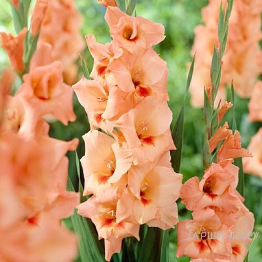 Гладиолус Питер Пирс 5 шт. - многолетнее клубнелуковичное растение семейства Ирисовых. Высота 90-110 см. Цветок абрикосовый с темно-оранжевым пятном. Цветение с июля по сентябрь.