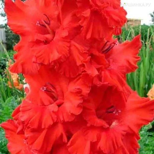 Гладиолус Подари Мне Улыбку - многолетнее клубнелуковичное растение семейства Ирисовых. Высота 180см. Крупноцветковый, высокорослый, гофрированный сорт. Окраска цветка красно-бордовая, перламутровые штрихи на внутреннем нижнем и верхнем лепестке в центре и по кайме.