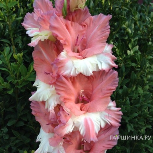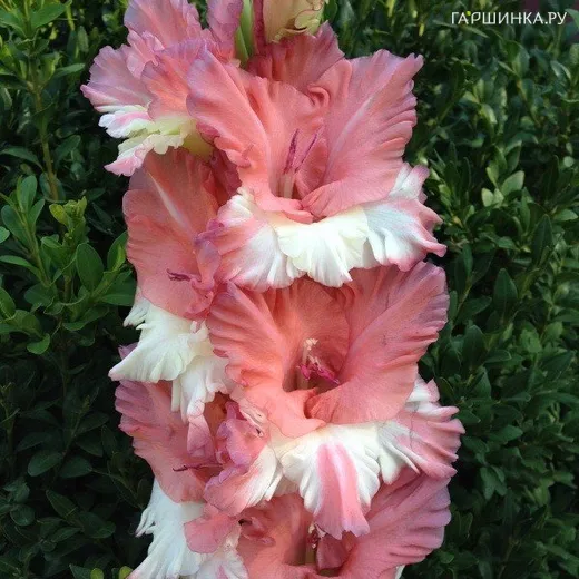 Гладиолус Портрет незнакомки - многолетнее клубнелуковичное растение семейства Ирисовых. Высота 150 см. Цветки гофрированные, размером 11,5-14 см. Оригинальное сочетание двух окрасок: верхние лепески розово-дымчатые, нижние белые. Очень красивый и изящный сорт.