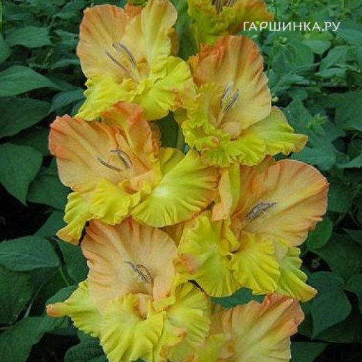 Гладиолус Расплавленное золото - многолетнее клубнелуковичное растение семейства Ирисовых. Высота 150см. Переливающаяся окраска этого гладиолуса – жёлто-салатовые тона нижних лепестков перетекают через золотистое горлышко к оранжево-розовым тонам верхних лепестков.