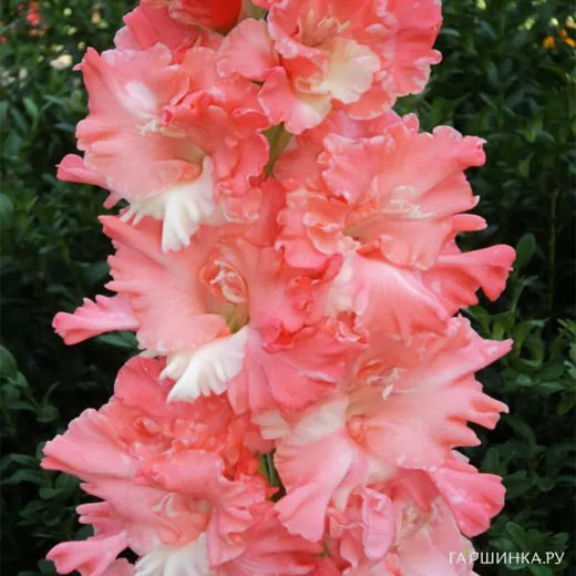 Гладиолус Розовый фламинго - многолетнее клубнелуковичное растение семейства Ирисовых. Высота 145-150см. Ярко-розовые с белым лепестком цветы супер гофрированы глубокими складками и защипами в горле. Очень плотная фактура лепестков.