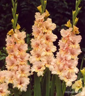 Гладиолус крупноцветковый Румба Фриззл 5шт. - многолетнее клубнелуковичное растение семейства Ирисовых. Высота до 120см. Размер цветков 12-15 см. Лепестки с гофрировкой, у основания желто-розовые, по краям бледно-кремовые. Цветение с июля по сентябрь.