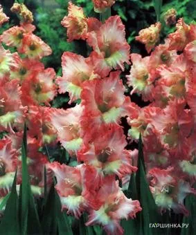 Гладиолус Серафин 5 шт. - многолетнее клубнелуковичное растение семейства Ирисовых. Высота 100-120 см. Привлекают взгляд крупные, до 18 см лососево-розовые цветы с нежно-желтым оттенком. Цветение с июля по сентябрь.