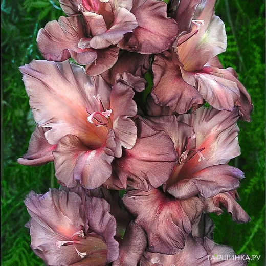 Гладиолус Серебряный Ручей - многолетнее клубнелуковичное растение семейства Ирисовых. Высота 155см. Крупноцветковый, высокорослый, гофрированный сорт. Окраска цветка каштаново-серая, дымчатый налет, розовое размытое пятно и наплывы на внутреннем верхнем лепестке в центре.
