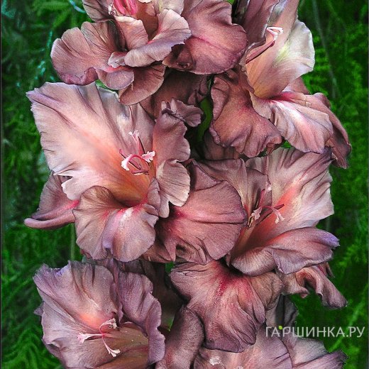 Гладиолус Серебряный Ручей - многолетнее клубнелуковичное растение семейства Ирисовых. Высота 155см. Крупноцветковый, высокорослый, гофрированный сорт. Окраска цветка каштаново-серая, дымчатый налет, розовое размытое пятно и наплывы на внутреннем верхнем лепестке в центре.