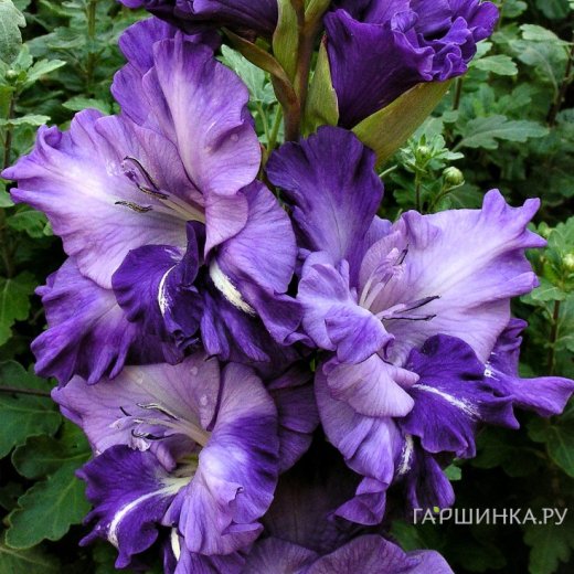 Гладиолус Синяя птица - многолетнее клубнелуковичное растение семейства Ирисовых. Высота 155 см. Яркий сливовый цвет с небольшим белесым пятном у центра и белыми кокетливыми стрелками.