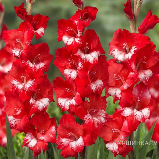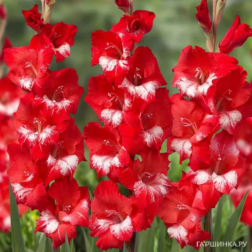 Гладиолус Спарклер - многолетнее клубнелуковичное растение семейства Ирисовых. Высота до 100 см. Размер цветка 14-16 см. Характерная особенность – интересная пестрая окраска крупных цветков. Пурпурно-алые лепестки украшает красивый перистый узор молочно-белого цвета. Цветение с июля по сентябрь.
