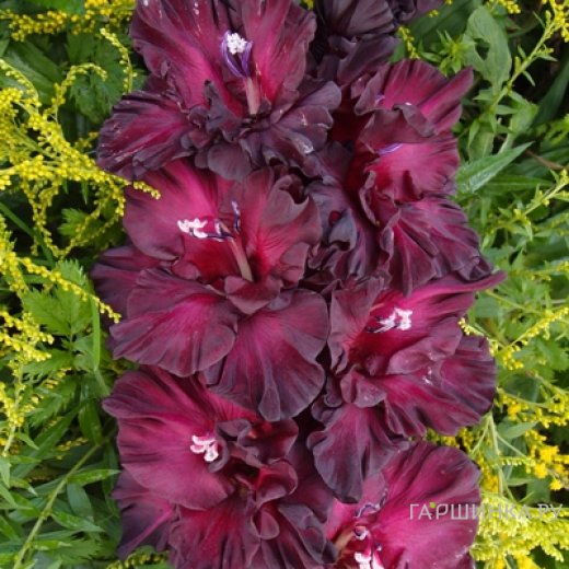 Гладиолус Таинство Ночи. Чёрно-красно-вишневый цвет, сгущается к контуру лепестков. Стройный колос, плотная укладка соцветия. Исключительно редкая для чёрного сорта супергофрировка. Соцветие 70 см. На соцветии 23 бутона, одновременно открыты 8. Высота растения: 140 см Диаметр цветка: 11,5-14 см.Срок цветения: раннесредний (80-84 дня)