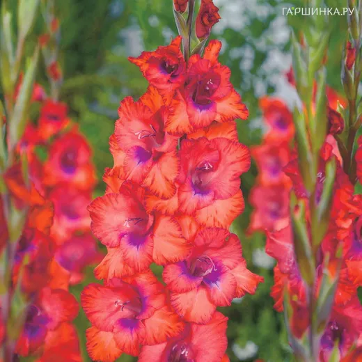 Гладиолус Триколор 5 шт. - многолетнее клубнелуковичное растение семейства Ирисовых. Высота: 90-100 см. Плотные соцветия из крупных оранжево-красных цветков. На нижних лепестках большие фиолетовые глазки в белой обводке. Края лепестков обозначены деликатной фиолетовой штриховкой. Цветение: август-сентябрь.