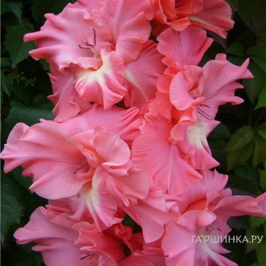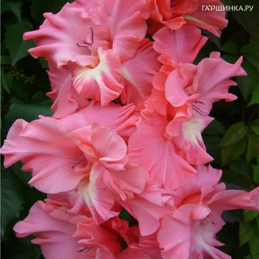 Гладиолус Вечный роман - многолетнее клубнелуковичное растение семейства Ирисовых. Высота 145 см. Окраска цветов с сильной гофрировкой розовая и красным напылением на нижних лепестках.