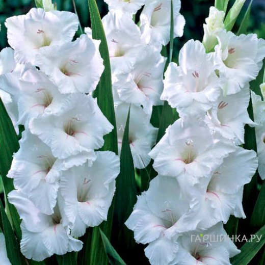 Гладиолус Вайт Проспирити 5шт - многолетнее клубнелуковичное растение семейства Ирисовых. Высота растения 100 -110 см. Цветок 12 -15 см. Бутоны крупные воронкообразные слегка гофрированны. Цветение с июля по сентябрь.