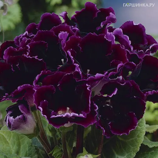Глоксиния Виолацея - цветки бархатного фиолетового оттенка с сиреневым кантом по краям слегка-гофрированных лепестков. Бело-кремовое горло исчерчено полосками и легкими веснушками такого же оттенка. Высота растения 25 см. Листья сочные ,темно-зеленые, узорчатые, бархатистые, опушенные. Диаметр цветка 8 см. Аромат тонкий, душистый. Период цветения июнь-сентябрь.