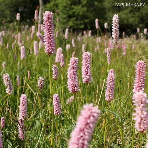 Горец змеиный - Компактный сорт высотой до 90 см. Прикорневые листья продолговато-яйцевидные, с заметными прожилками, тёмно-зелёные, осенью краснеют. Цветки светло-розовые, в плотных цилиндрических соцветиях длиной 7 см. . Цветет с весны и до конца лета. Зона зимостойкости: 3