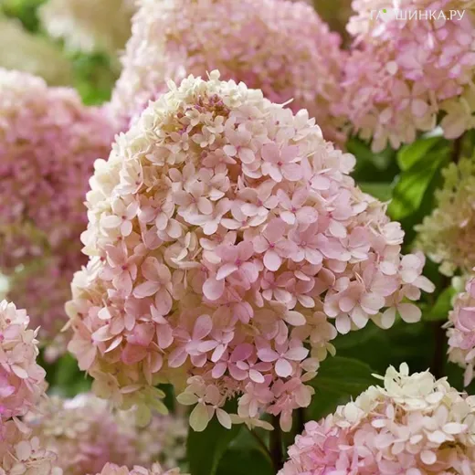 Гортензия Литл Лав метельчатая - компактный куст с прочными побегами.. Высота и ширина взрослого растения до 80 см. Соцветия шарообразной формы. В начале роспуска соцветия зеленые, затем кремовые, к осени розовеют. Гортензия хорошо зимует в открытом грунте. Зацветает на побегах текущего года.