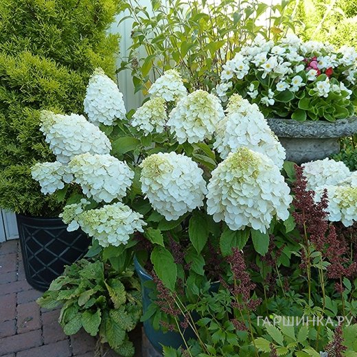 Гортензия Мэджикал Монблан метельчатая - компактная, обильноцветущая гортензия с крупными, конусообразными соцветиями и легким ароматом. Белые соцветия с салатовой верхушкой приобретают нежно-розовую окраску в конце сезона. Период цветения с июля до сентября. Обрезка весной. Максимальная высота взрослого растения до 120 см.