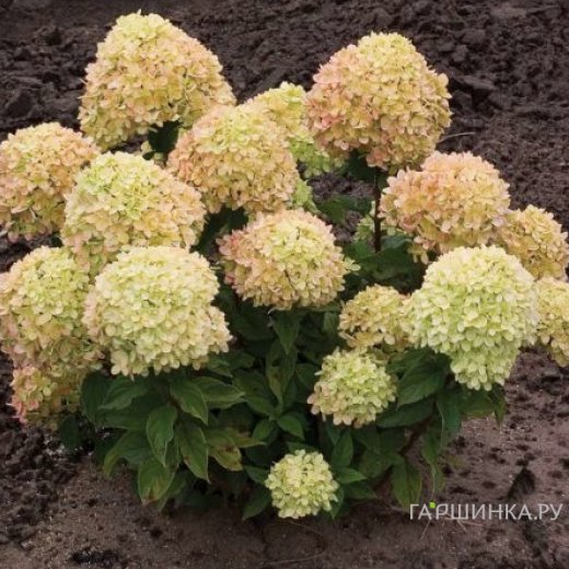 Гортензия Коттон крем (Хлопковый крем) метельчатая - Цветет с июля до осени. Цветки с кремовыми, округлыми цветками, при распускании цветки зеленоватые, затем становятся кремовыми и в конце цветения слегка розовеют, соцветия плотные. Компактный кустарник высотой до 0,8 м. Соцветия небольшие. Цветет начиная с июня и до октября. Зацветает уже в год посадки. Вынослива и неприхотлива. Зимует без укрытия, но молодые растения рекомендуется мульчировать на зиму.