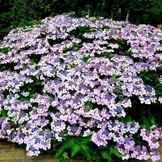 Гортензия Блюберд (Синяя птица) пильчатая - Красивый куст, высота 120 см. Соцветие плоское, зонтик, внутри маленькие розовые или лиловые цветки, тычинки голубые, по краям цветки крупнее светло-фиолетовые и ярко синие, зависит от состава почвы.