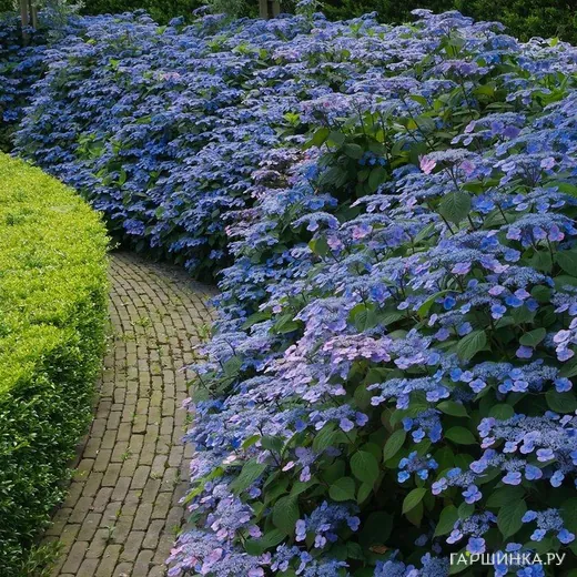 Гортензия пильчатая Вирл - Цветки блестящие, голубые или розовые (в зависимости от кислотности почвы). Очень компактный плотный кустарник высотой 100-120 см. Соцветия диаметром 5-10 см. Лепестки перекрывающиеся, с красивыми краями. Цветение в июле-сентябре. Листья осенью – красно-фиолетовые. Место полутенистое, защищённое, почва влажная, дренированная. На зиму требуется укрытие сухими листьями или бумагой, лапником.