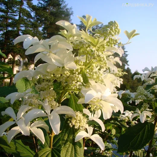 Гортензия Стар Роуз (Звездная роза) метельчатая - представляет собой куст высотой до 2 метров, с прочными побегами темного красного, переходящего в коричневый, цвета. Соцветия состоят из фертильных и стерильных цветков больших размеров. Каждое соцветие достигает 10 см в диаметре. По форме оно напоминает пропеллер, так как лепестки длинные, узкие, широко поставленные, возникает эффект порхающих бабочек. Сами соцветия имеют белый цвет, но в конце сезона меняют свою окраску на розоватый оттенок, но не полностью. В итоге получается очень красивая бело-розовая окраска соцветия. Длина его может достигать 15 см. Цветы имеют неповторимый, тонкий аромат.