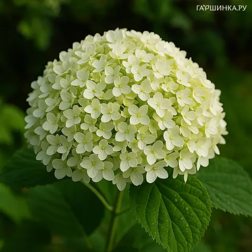 Куст густой, со временем приобретает округлую форму. Высота взрослого растения 1,1–1,5 м, ширина до 2 м. Побеги крепкие, светло-зелёные, не полегают под тяжестью соцветий. Листья крупные, овальные, летом насыщенно-зелёные, осенью с лимонным оттенком. Бархатистая фактура листовой пластины придаёт растению особую выразительность.