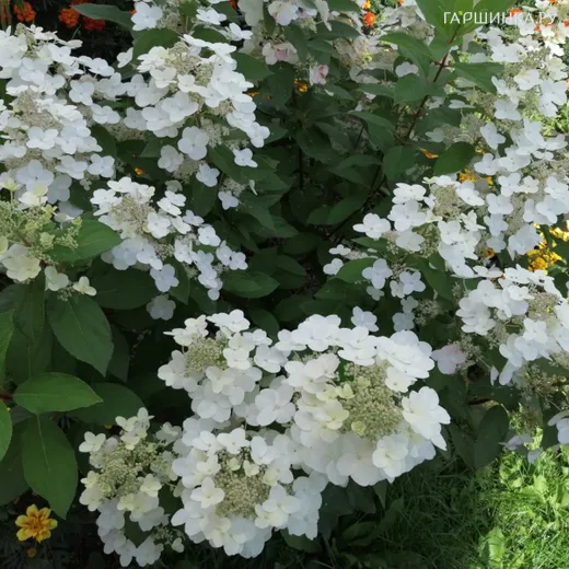 Гортензия Юник (Уникальный) метельчатая - Высота кустарника до 2,5м, ширина 2,5 м. Цветение обильное и продолжительное. Длина и ширина соцветия 25 см. Окраска соцветия кремово-белая, осенью розовая. Конусовидные соцветия достигают в длину 25 см и состоят из мелких 4-лепестковых цветков, не дающих плодов. Соцветия располагаются на концах длинных побегов и достигают в диаметре 25 см. Первое цветение в год посадки. Листья очень темные. Куст быстрорастущий. Цветет на побегах текущего года. Достоинством сорта является возможность его посадки как в составе сложных ансамблей, так и в одиночных композициях. И в том и в другом случае куст выглядит очень ярко и броско, нередко играя роль центрального элемента.