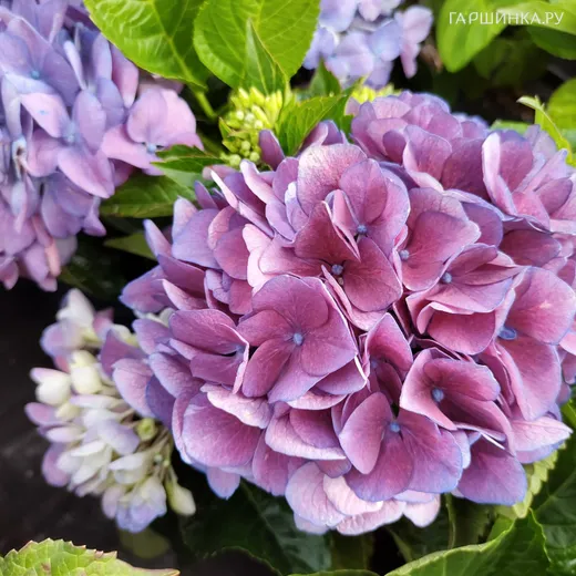 Гортензия Амор крупнолистная (макрофила) - Компактный, густой листопадный кустарник высотой около 100 см с крупнозубчатой темно-зеленой листвой. Округлые грозди цветочных головок от темно-синего до фиолетового цвета появляются с июня по сентябрь.